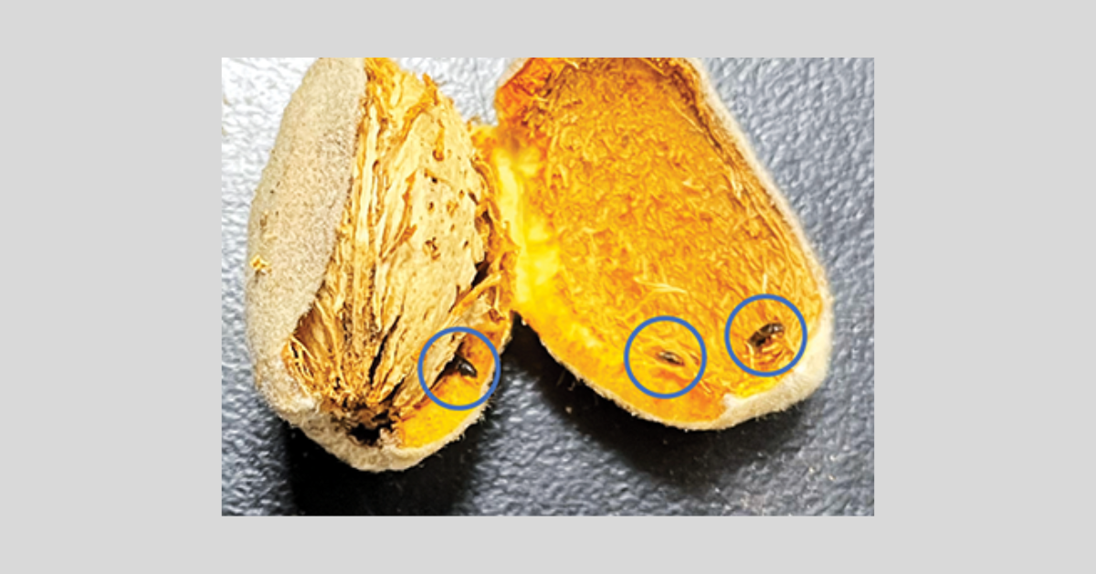 If the beetle is present in an orchard, Wilson said that growers may observe a “fine powdery frass on infested nuts” and added that “feeding activity from adults and/or larvae can also sometimes result in oval-shaped tunnels in the kernel.”