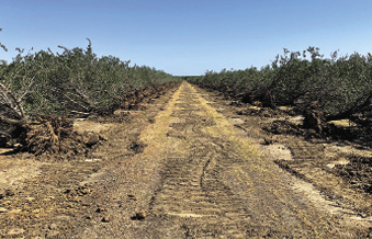 Almond trees at Woolf Farming in Fresno County were bulldozed this year because there wasn’t enough water to irrigate them. More trees are expected to fall across the San Joaquin Valley. Photo: Daniel Hartwig
