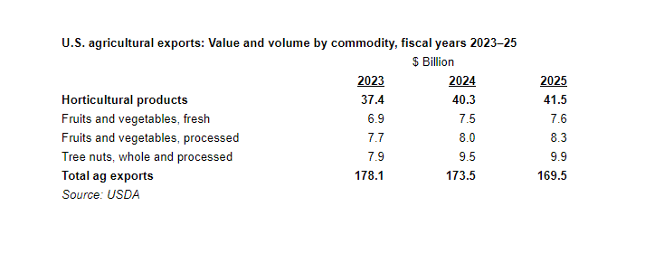 In 2025, horticultural product exports are expected for a record $41.5 billion, up $1.2 billion from 2024.